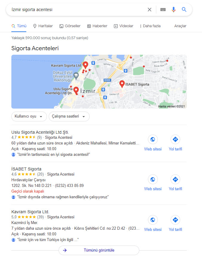 - Nasıl Fayda Sağlar? İşletme haritaları, sunduğunuz hizmetin bir çok kişi tarafından farkedilmesini sağlayan en önemli unsurlardan biridir. Özellikle yerel anlamda işleri büyütmenize yüksek oranda katkı sağlar. Örneğin Google’da “Karşıyaka Sigorta Acentesi” şeklinde bir arama yapıldığında çıkan sonuçlarda işyeri haritanızın yer alması, yeni bir müşteri kazanma olasılığı doğurmaktadır.